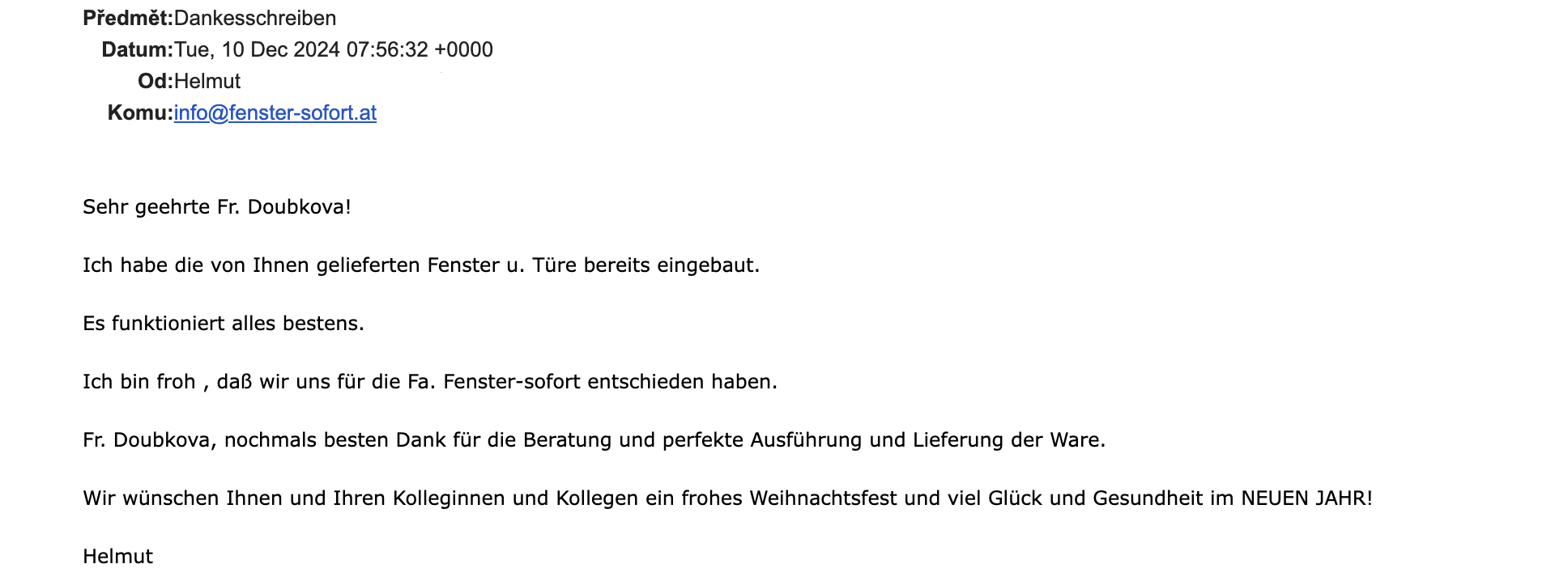 Doubková asszony, még egyszer köszönöm a tanácsát és a tökéletes kivitelezést és szállítást.