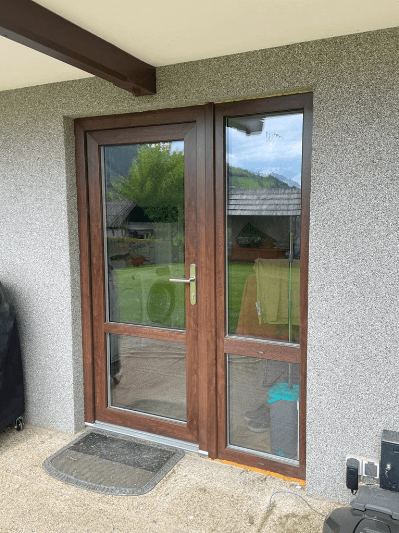 Hollandiai ügyfelünk számára három műanyag erkélyajtót és két ablakot szállítottunk kétoldali dió dekorral. Az eredmény egy egységes és stílusos megjelenés, amely tökéletesen illeszkedik a ház egészéhez.