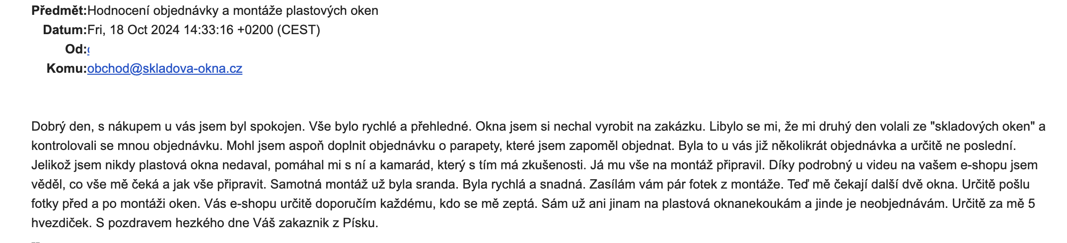 Helló, elégedett voltam az Öntől való vásárlásommal. Minden gyorsan és tisztán történt. Az ablakokat egyedi megrendelésre csináltattam. Tetszett, hogy másnap felhívtak a „raktárablakokról” és leellenőrizték velem a rendelést. Így legalább a rendelést kiegészíthettem a párkányokkal, amiket elfelejtettem megrendelni. Ez már többször volt megrendelésem Önöknél és biztosan nem az utolsó. Mivel még soha nem szereltettem be vinil ablakokat, egy ismerősöm segített, akinek van tapasztalata ezzel kapcsolatban. Mindent előkészítettem neki a beépítéshez. Az Önök webáruházában található részletes videónak köszönhetően tudtam, hogy mi minden vár rám és hogyan kell mindent előkészíteni. Már maga a szerelés is szórakoztató volt. Gyors és egyszerű volt. Küldök néhány képet az összeszerelésről. Most még két ablakot kell beszerelnem. Mindenképpen küldök majd előtte és utána képeket az ablakok beépítéséről. Mindenképpen ajánlani fogom a webáruházukat bárkinek, aki megkérdez. Én magam nem is járok bakelit ablakokhoz és nem is rendelek máshonnan. Egyértelműen 5 csillagot kaptam. Tisztelettel, szép napot kívánok Az Ön vásárlója Piszekből.