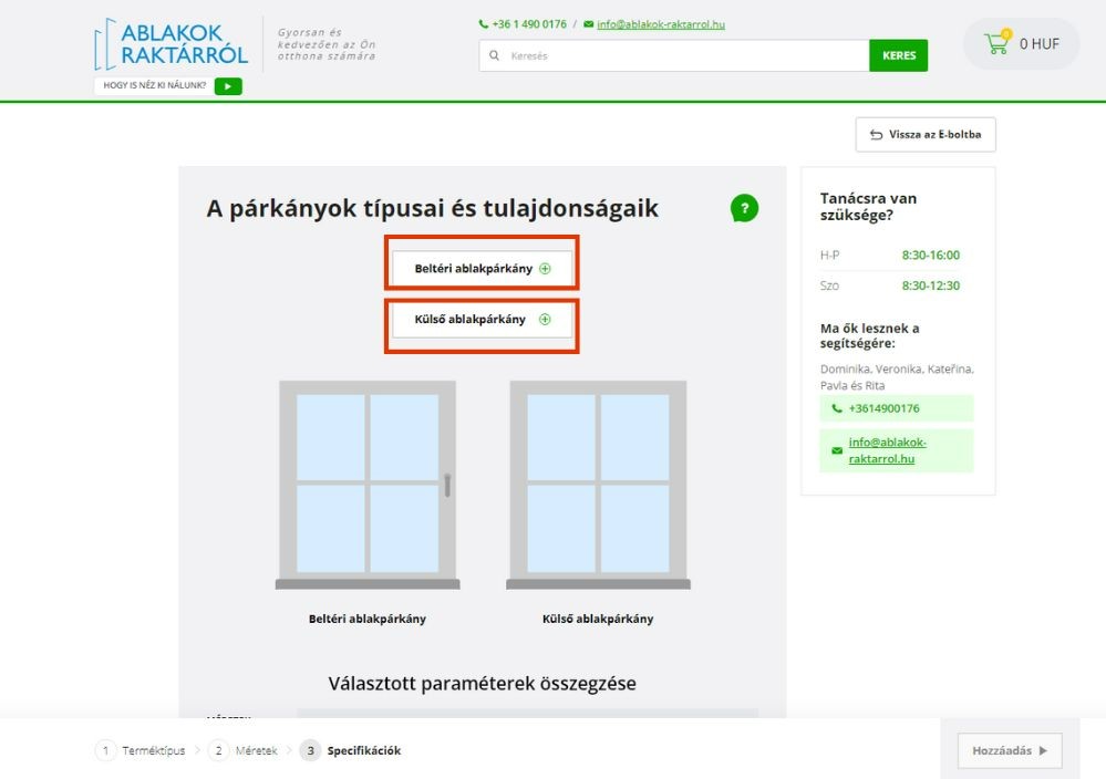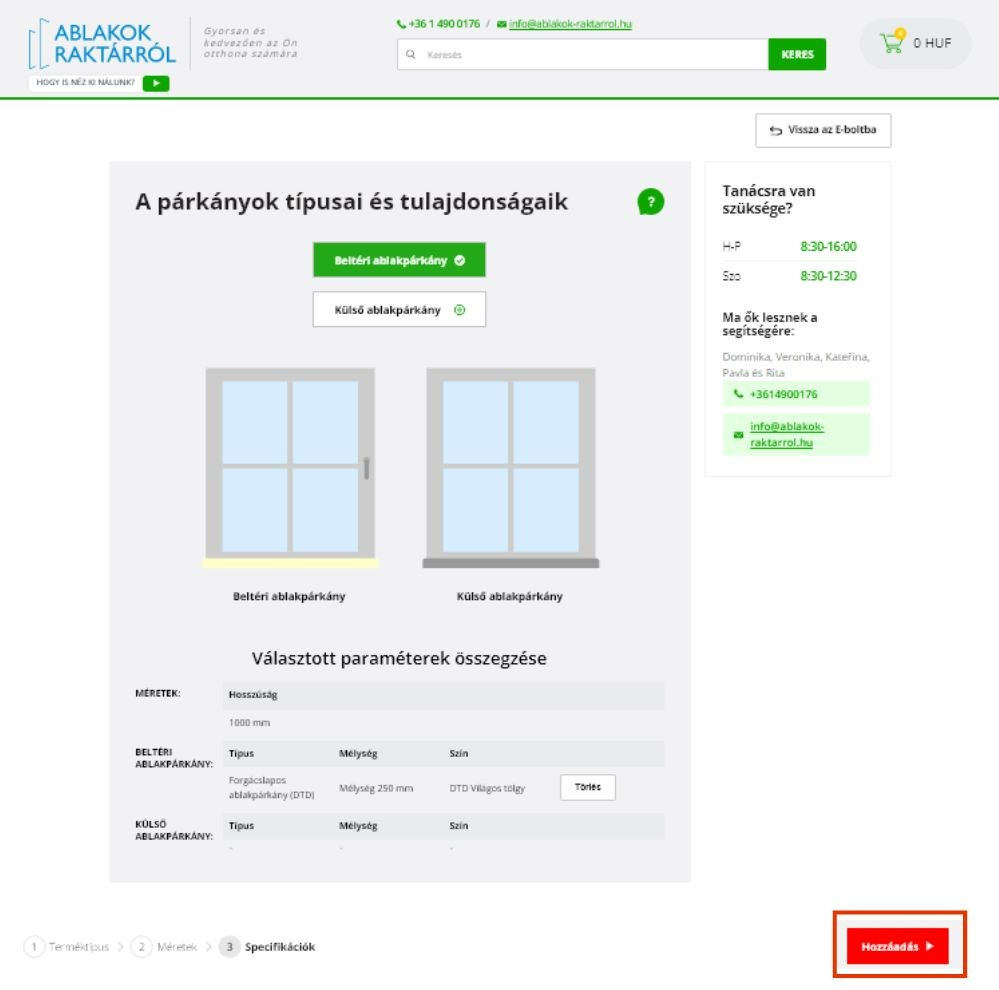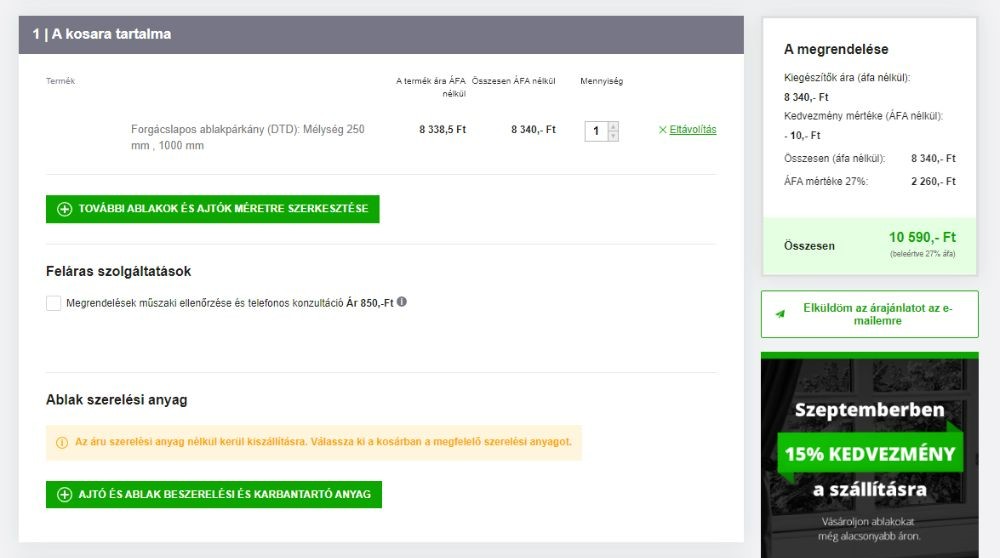 6. A kiválasztás megerősítése után megjelenik a paraméterek összesítése. Ellenőrizze, és erősítse meg annak érdekében, hogy az ablakpárkányok bekerüljenek a kosárba.