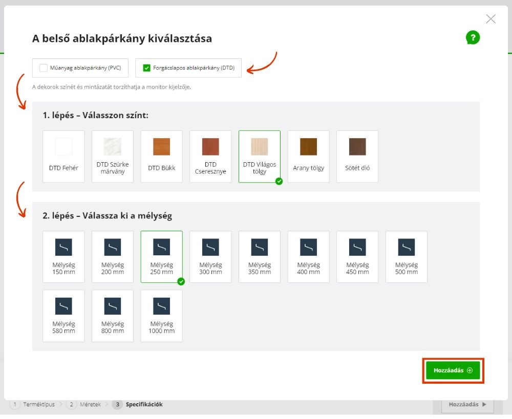 Kiválaszthatja a belső és külső ablakpárkány anyagát. Belülre kínálunk műanyag (PVC) vagy forgácslap (DTD) ablakpárkány, kültérre hajlított vagy húzott alumíniumot. Ezután válassza ki a termék színét és mélységét.