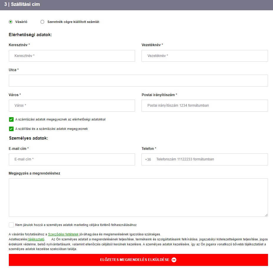Az utolsó lépésben ki kell töltenie az adatait, de akár egy másik szállítási/számlázási címet is megadhat. Végül kattintson a piros Megrendelés elküldése gombra.