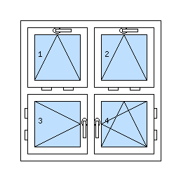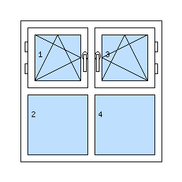 Négyszárnyú műanyag ablak-tól 122 750 HUFAlul kétszárnyú ablak tokosztóval (a bal szárny nyíló, balos, a jobb szárny bukó-nyíló, jobbos), felül mindkét szárny fix