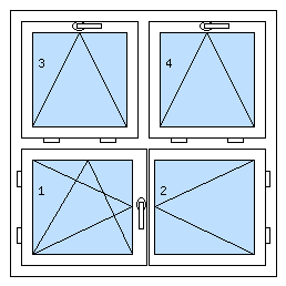 Négyszárnyú műanyag ablak-tól 147 950 HUFAlul kétszárnyú ablak tokosztóval (a bal szárny nyíló, balos, a jobb szárny bukó-nyíló, jobbos), felül 2 bukó szárny