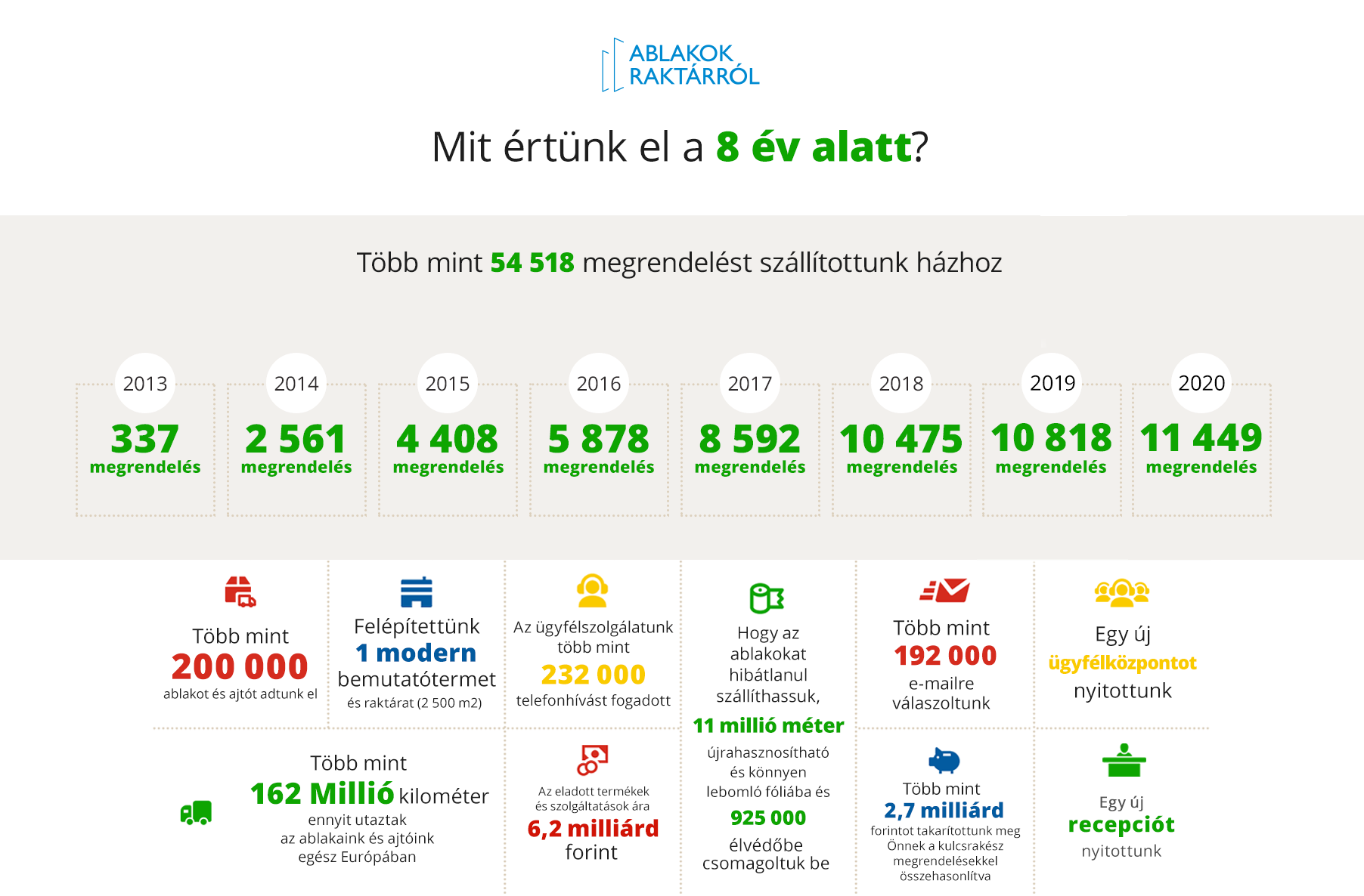 Annak ellenére, hogy a 2020-as évre rányomta a bélyegét a járvány és mindenki számára nehéz időszak volt, a vásárlóink tavaly is szebbé varázsolták az otthonukat és nagyon örülünk, hogy segíthettünk benne. A képen láthatja, mi mindent értünk el a webshopunk indulása óta, mennyi ablakot és ajtót szállítottunk házhoz és így mennyi pénzt spóroltak meg a vásárlóink. Ha már az értékelésnél tartunk, meg kell említenünk, hogy a múlt év vége óta már Magyarországra is szállítunk.