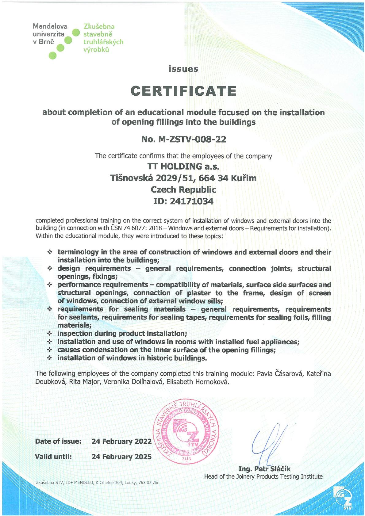 Folyamatosan törekszünk a fejlődésre, ezért a brünni Mendel Egyetemhez tartozó Építőipari és Asztalosipari Termékek Vizsgálólaboratóriumával együttműködésben képzést szerveztünk cégünknél. Így minden ügyfélszolgálati munkatársnőnk elvégezte a felújított házak, új épületek valamint műemlék épületek lyuktöméseinek beépítésére irányuló képzést.Ennek köszenhetően most még jobb tanácsokat tudnak adni olyan témákban, mint az ablakok lemérése, mire érdemes figyelni a beszerelésük során vagy mit lehet tenni, ha az ablakok túlpárásodnak vagy esetleg penészedni kezdenek.