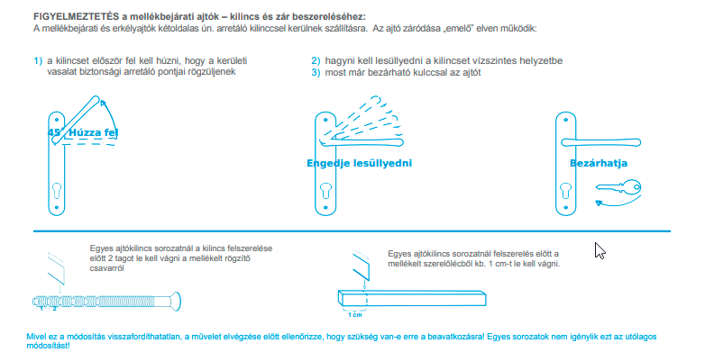 FIGYELMEZTETÉS a mellékbejárati ajtók – kilincs és zár beszereléséhez: